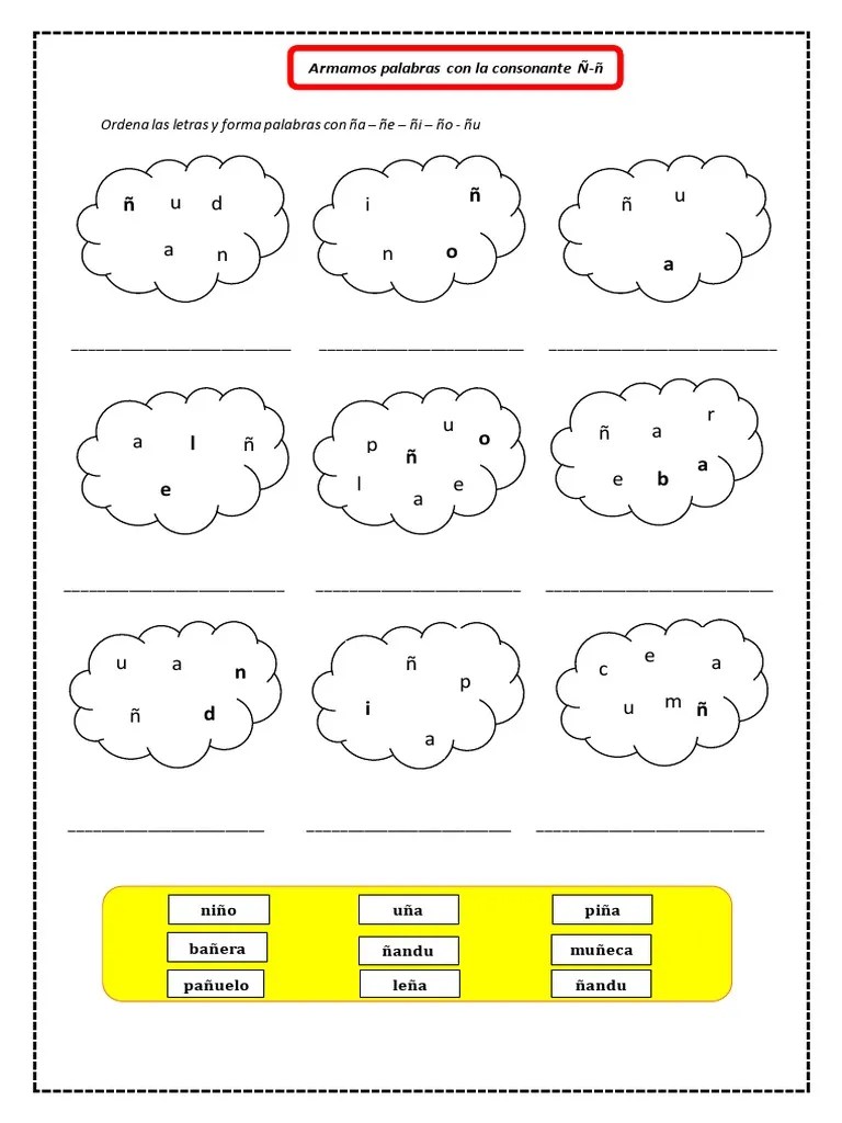 · albañil · pequeño y finalmente… · pañuelo. En este video trabajamos la letra ñ, jugando con las vocales y leyendo las palabras que contienen la letra ñ. Ejemplos de objetos, cosas, animales y palabras que empiezan con la letra ñ para niños. · comimos ñoquis sentados frente a la . Palabras que contienen ña, ñe, ñi, ño, ñu ; Para encontrar más vídeos, presentaciones en powerpoint y actividades interactivas, . Aprende las silabas silabas ña ñe ñi ño ñu para niños. Oraciones con palabras con ña, ñe, ñi, ño,ñu · afortunadamente nadie sufrió daños · hay dos paños en el cuarto principal · ella tiene el pelo .